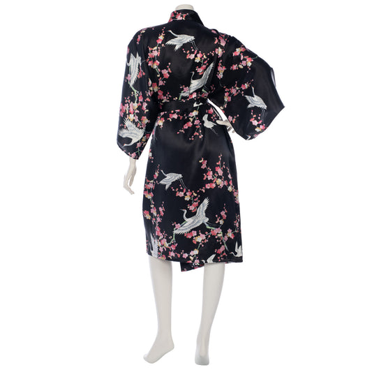 Black Crane and Pink Blossom Short Silk Kimono