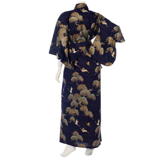 Navy Crane and Pine Long Japanese Kimono